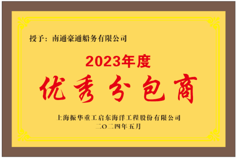 南通豪通船務(wù)獲上海振華重工啟東海洋工程股份有限公司2023年度“優(yōu)秀分包商”稱號